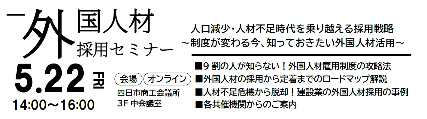 (5/22)外国人材採用セミナー「人口減少・人手不足時代を乗り越える採用戦略~制度が変わる今、知っておきたい外国人材活用~」のご案内